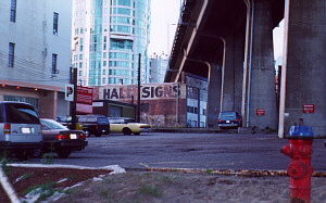 The first stop was to check under the Granville Bridge to see if it was the BLACKMAIL location. (This is one I obsessed over back home, determining that the weird arrangement of a street under a bridge with two access ramps had to be this place and tried to get Hugh to confirm the odd building in the background before our trip.) It was! I was so excited and asked Hugh to pull over so I could take pictures. Everything was there - the weird building, the ramps overhead, even the word "SIGNS" painted on a building off to the side way in back. It was so cool.